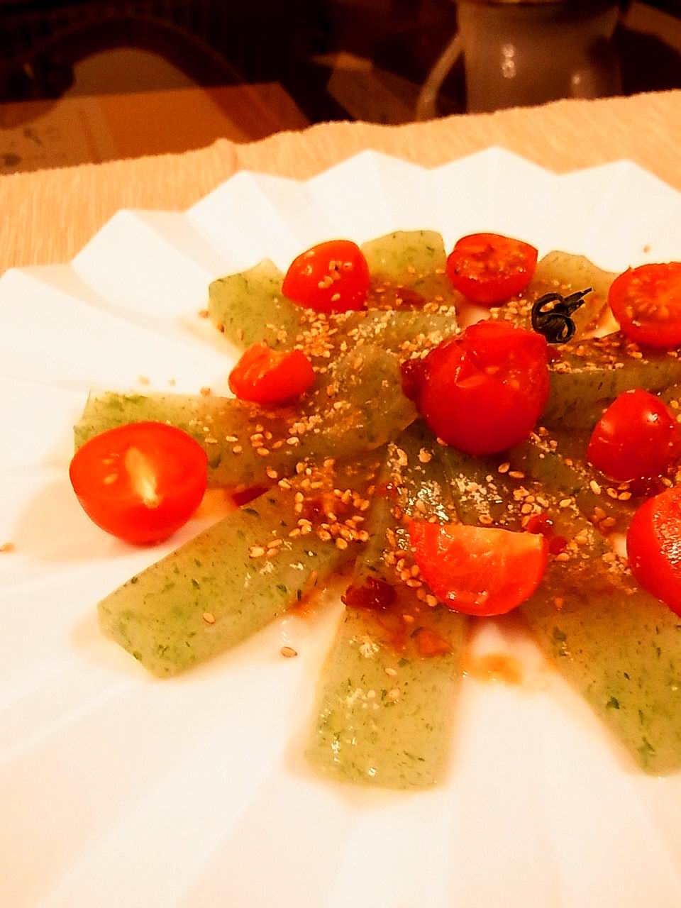 ・器にさしみこんにゃくを盛り、うえに切ったプチトマトをいろどりよく飾る。