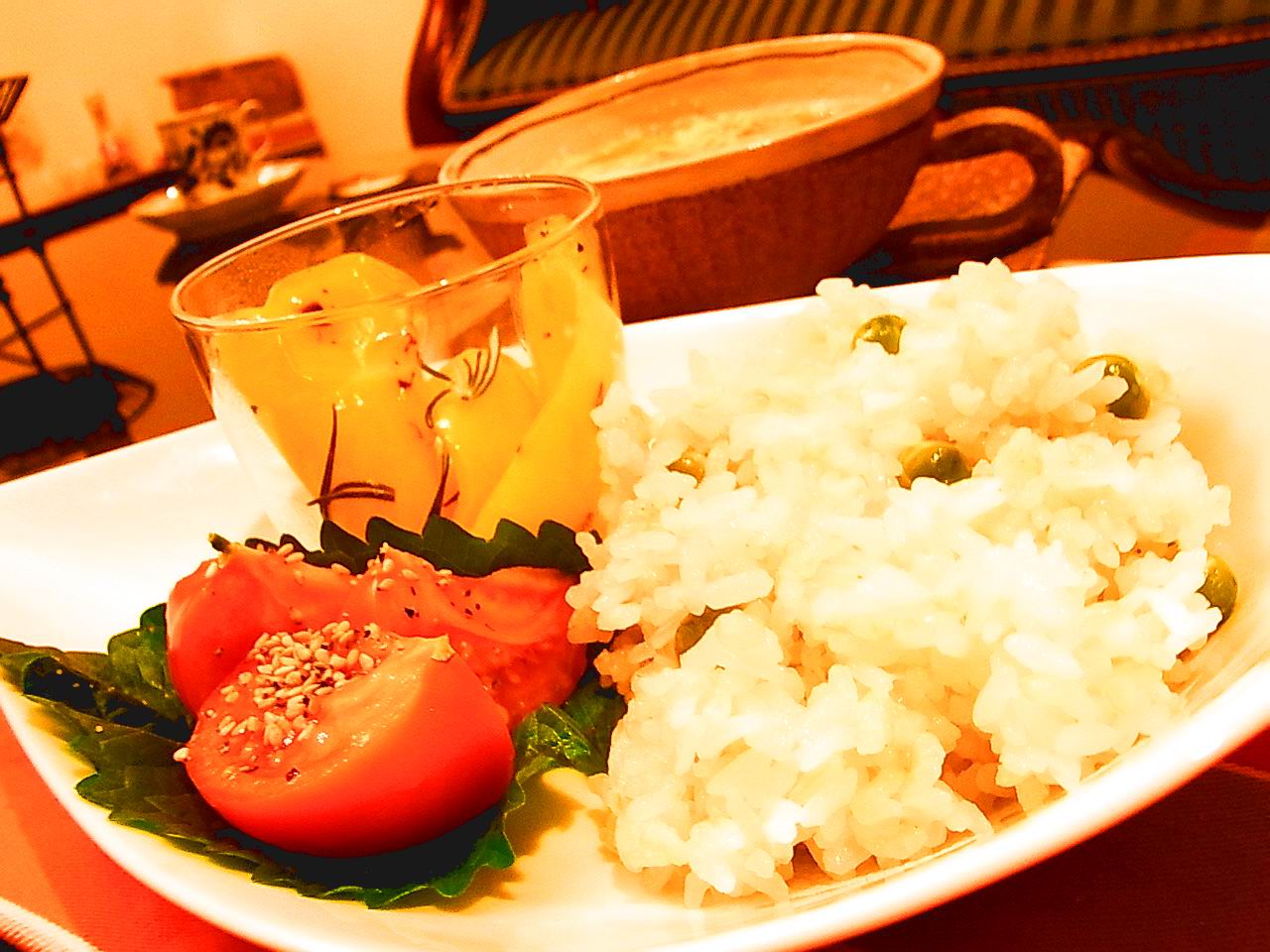 ・うすいえんどうの豆ご飯 / パプリカの白ワイン煮 / トマトのごま塩和えwith青じそ
