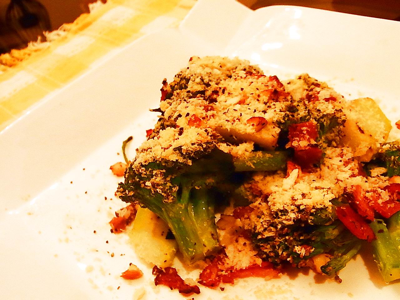 ・ベーコンにさっと火を通したら、軽く茹でor蒸したブロッコリーを小房に分けたものを投入し、炒める。アーモンドを粗みじんにしたものも加えて炒める。