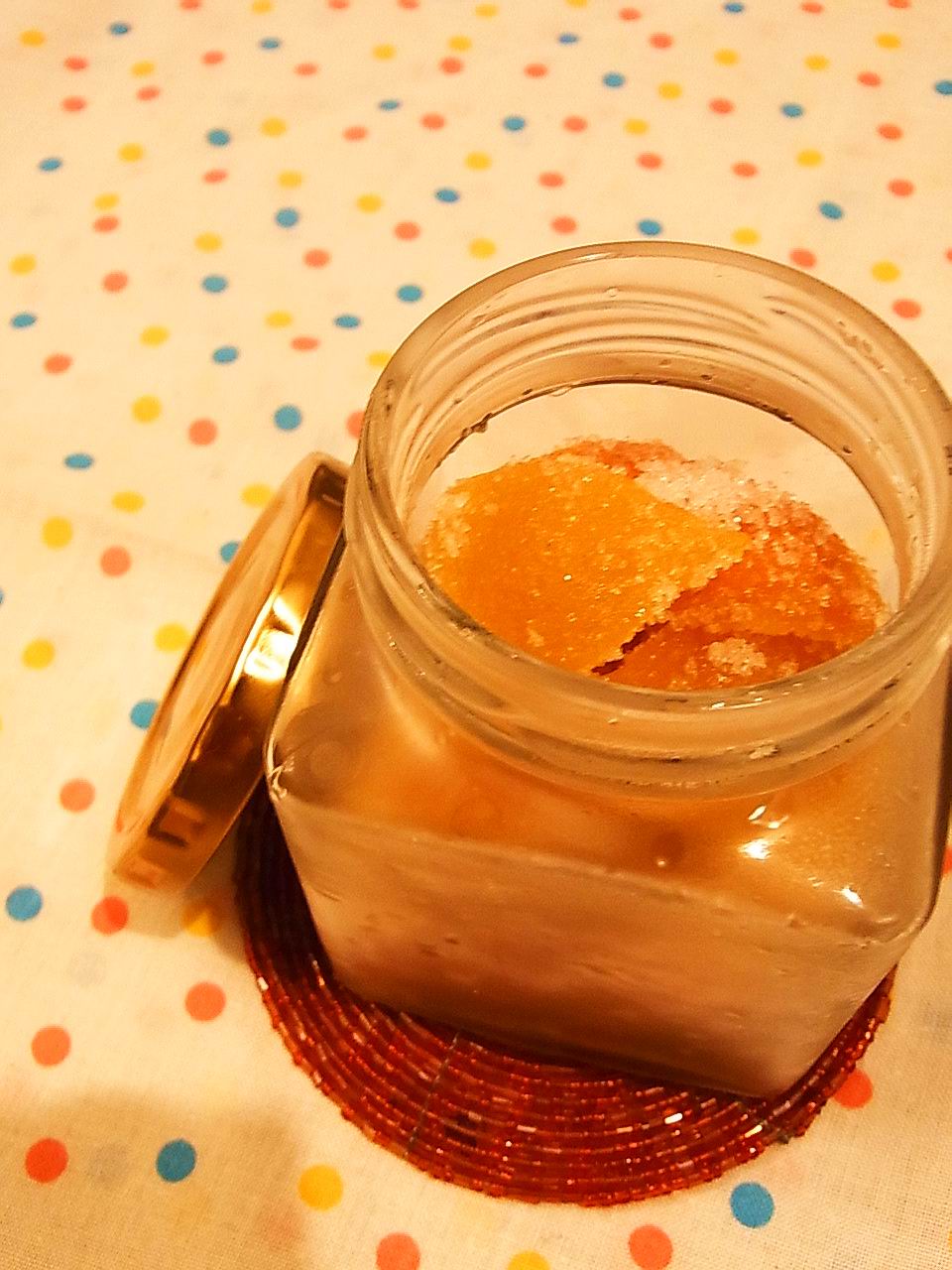 (このシロップは、鍋に入れて火にかけて、煮沸消毒した瓶に入れて、保存。