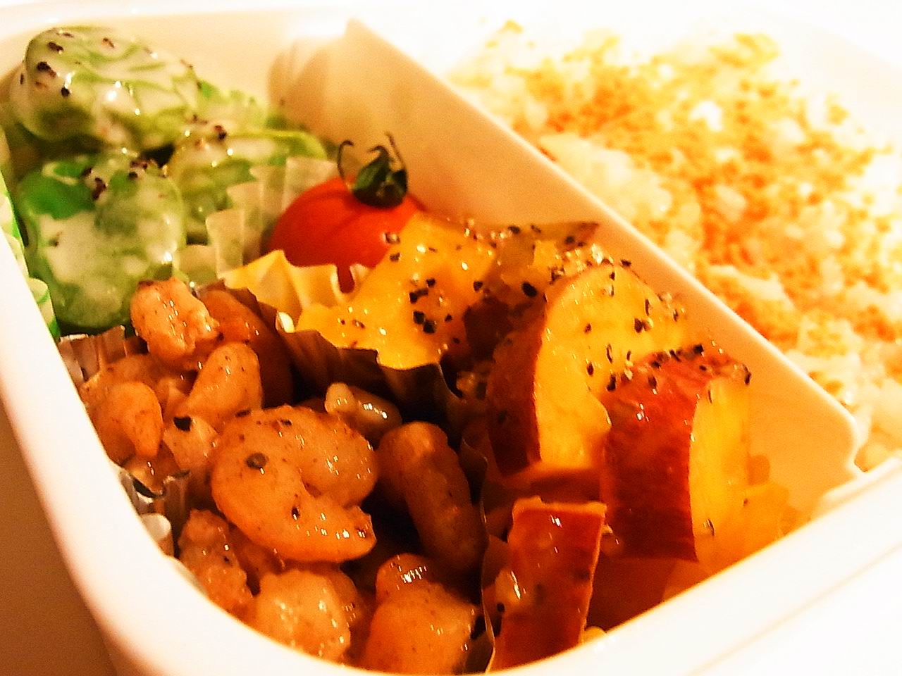・そらまめのにんにくマヨ和え、えびのマヨオイスター炒め、プチトマト、しゃけごはん